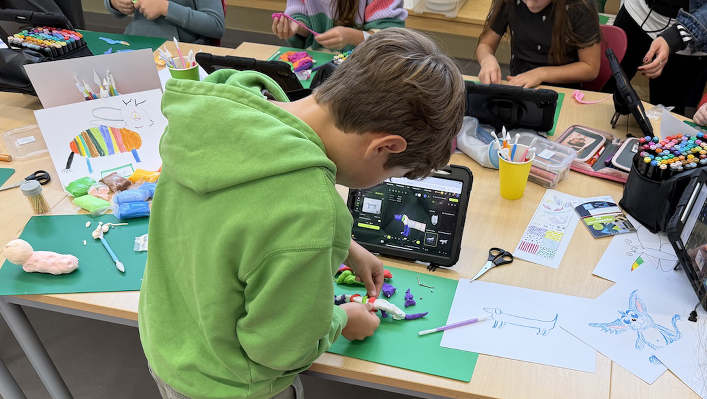 Im nächsten Schritt übertragen die Kinder ihre Motive in eine haptische Form und gestalten daraus eigene Figuren aus Knetmasse. So entsteht ein kreativer Prozess, der digitale und analoge Gestaltung miteinander verbindet.