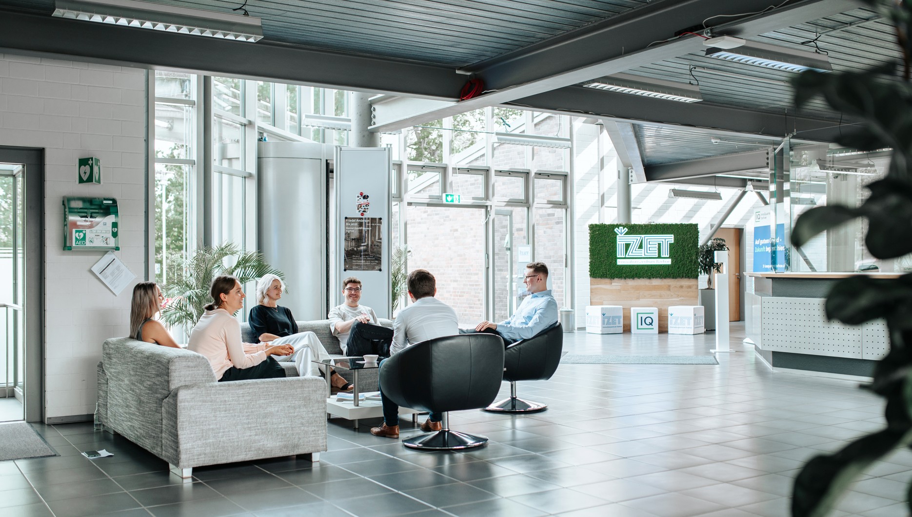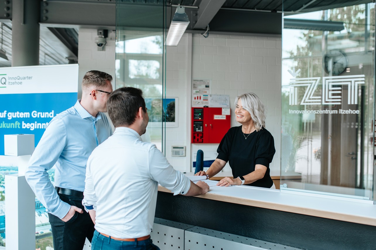 Am Haupteingang des Innovationszentrums Itzehoe (IZET), gut erkennbar am IZET-Logo, ist der Zugang stufenfrei erreichbar. Die Drehtür ist mit einer barrierefreien Bedienmöglichkeit ausgestattet: Rollstuhlfahrer können einen erreichbaren Knopf drücken, um die Drehgeschwindigkeit der Tür anzupassen und somit sicher und langsam zu passieren. Zusätzlich gibt es eine extra breite Nebeneingangstür (links der Drehtür), die jedoch nicht automatisch geöffnet wird.